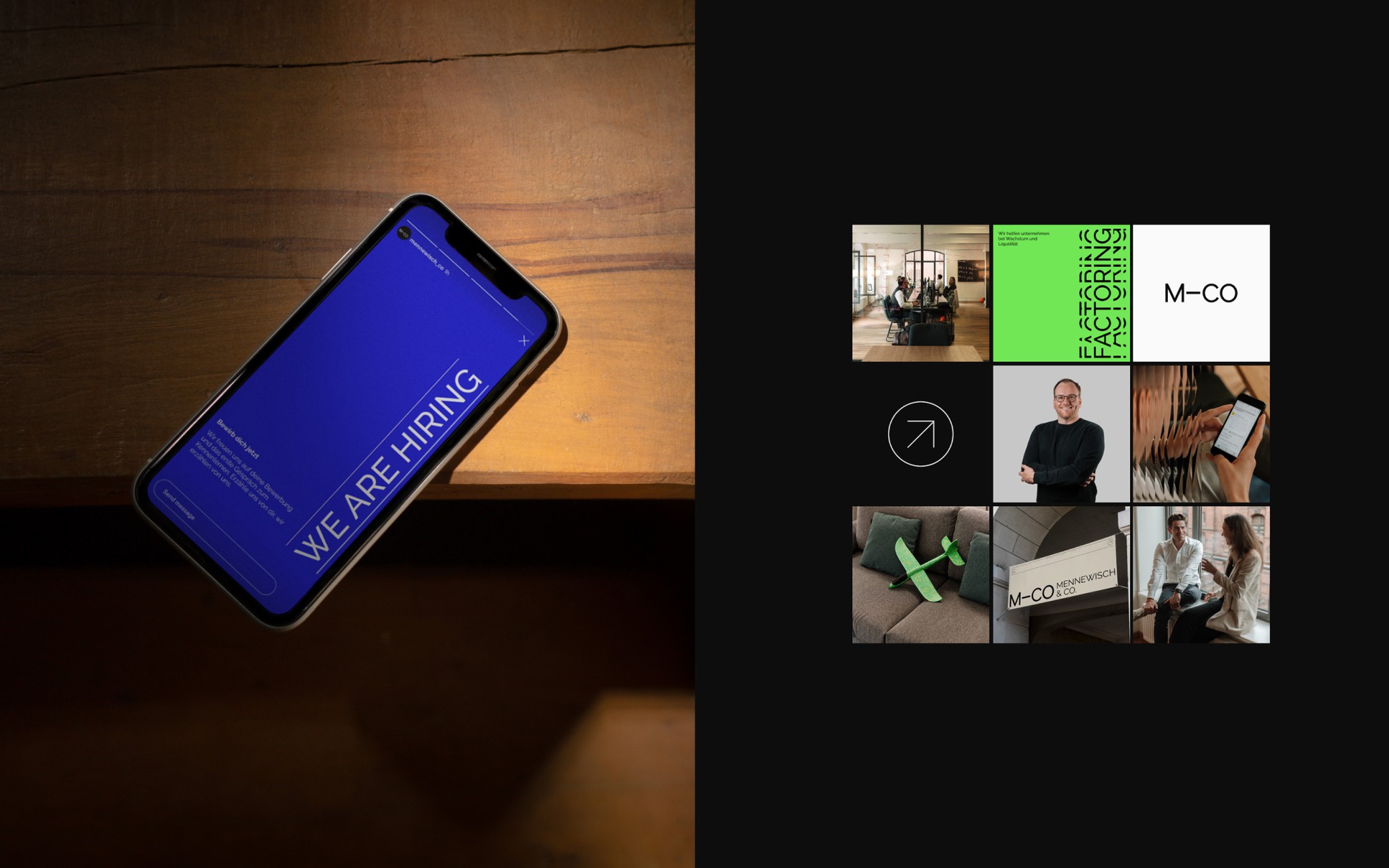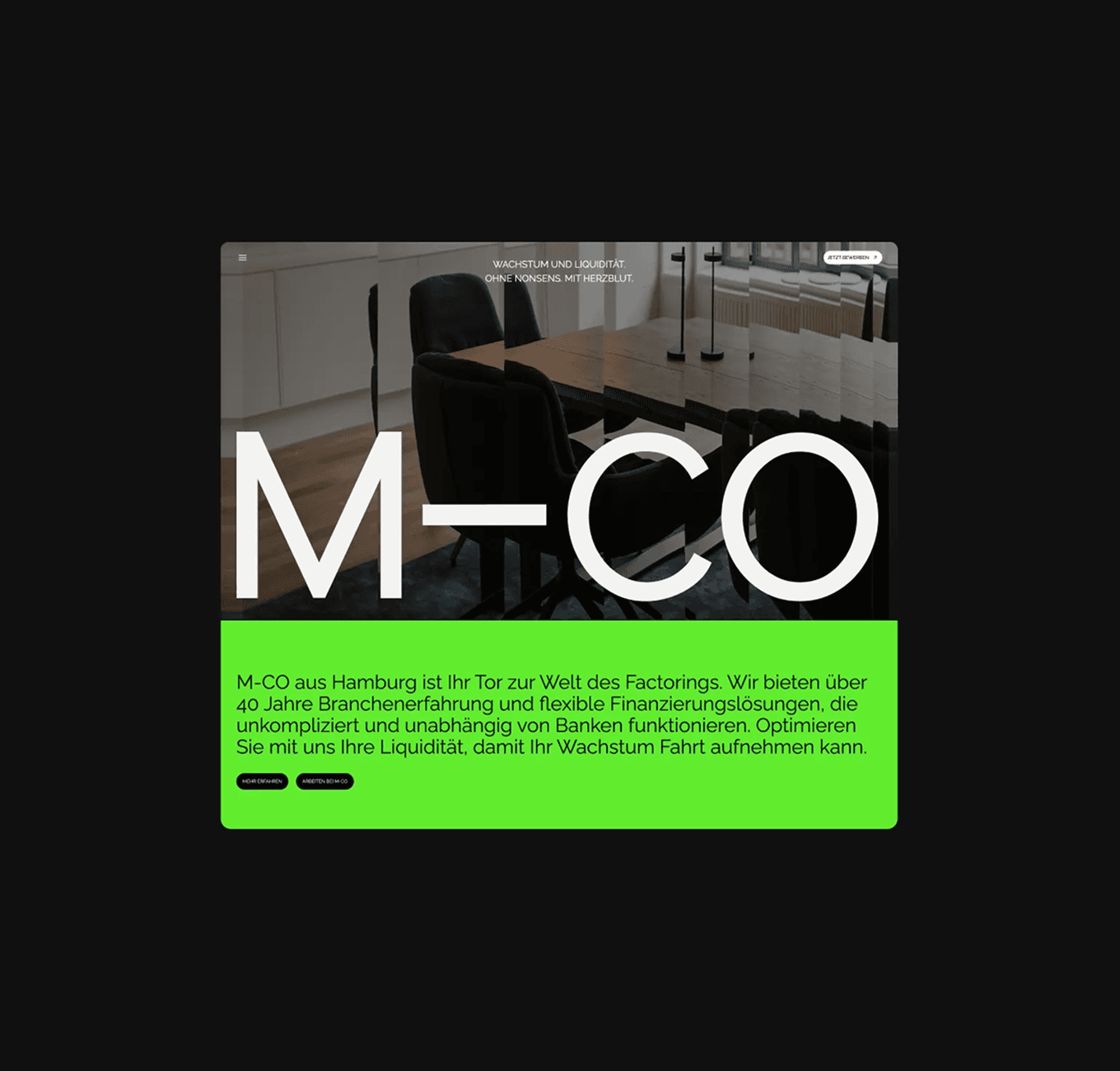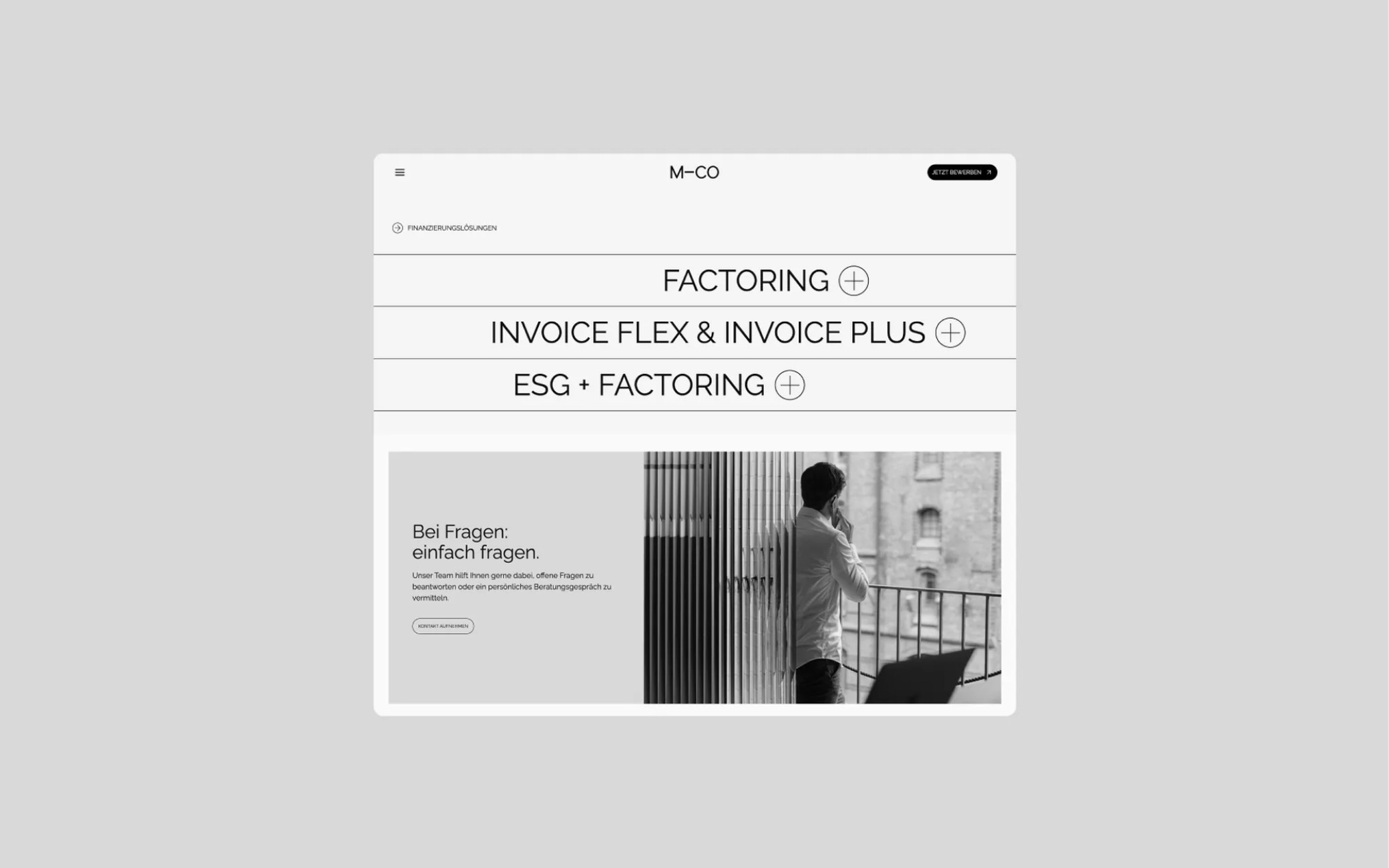 For M-CO, a Hamburg-based finance company specializing in factoring, I developed a brand identity that balances trust, clarity, and modernity. From logo and visual system to UX/UI and web design, the goal was to translate complex financial services into an accessible, confident digital presence — including art direction for imagery in collaboration with Marcel Frommer.